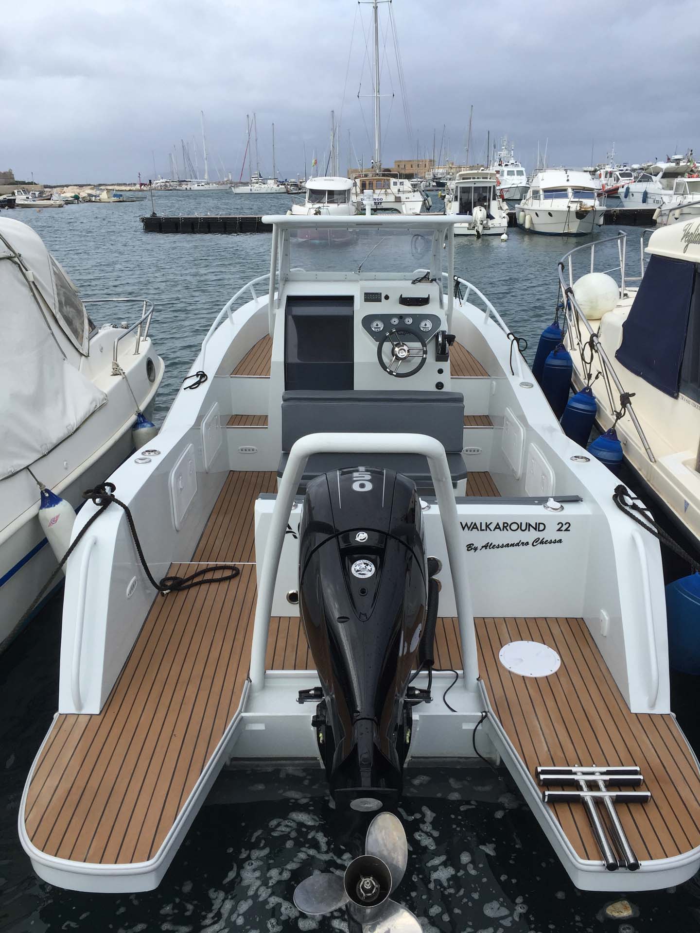 La V a geometria variabile unita alla leggerezza dell' alluminio rendono l' Akes 22 walkaround adatto a essere motorizzato con fuoribordo di potenza contenuta. Molta attenzione è stata prestata all' ottimizzazione della stabilità da fermo, requisito fondamentale per la pesca ma anche per il relax alla fonda.Gli spazi interni hanno una volumetria e uno sfruttamento che è difficile da trovare in una barca da 22 piedi. A dispetto della larghezza massima esterna (2.55 m) , che consente la carrellabilità, la larghezza interna, grazie allo scafo a doppia murata internamente verticale , è di 2.05 metri interamente fruibili e calpestabili. A poppa le due plancette integrate , unite con la spiaggetta a filo,costituiscono una zona di comodo accesso e risalita dal mare. Senza scavalcare niente, senza barriere architettoniche, con il rollbar centrale che fa da appiglio e non impedisce il sollevamento completo del motore. All' interno del pozzetto i due divani contrapposti, di cui il prodiero ospita le batterie e la eventuale vasca del vivo, e il centrale, che al suo interno può contenere la ghiacciaia e costituisce anche un comodo poggiareni per 2 persone, consentono a 6 persone di usufruire della zona relax allestibile a zona pranzo con tavolo-prolunga, il quale può essere anche utilizzato come prolunga prendisole. Gli incassi sulle murate interne sono utili per riporre mezzo marinaio e canne da pesca, attrezzature, fucili sub, e da quella zona è di facile accesso il filtro carburante. La consolle, di tipo walkaround, ha un amplissimo piano dove possono trovare posto gps-plotter da 10 pollici, ecoscandaglio, bussola, vhf, flussometri, radio,e ogni tipo di strumentazione, il tutto accessibile e all' altezza giusta. Sulla parte sinistra delle consolle la porta di ingresso è apribile a compasso e viene bloccata sotto l' Air-Top, il quale costituisce un valido riparo contro il sole , il vento, e fa da supporto ai portacanne e alle antenne. L' interno della cabina prevede una zona libera con bagno, e un letto di generosissime dimensioni, oltre 1 metro e 80 di lunghezza per 2 metri di larghezza . Infine a prua il layout prevede un prendisole a "chaise longue", accessibile grazie a due profondi passaggi laterali che percorrono tutta l' imbarcazione e la rendono completamente fruibile.