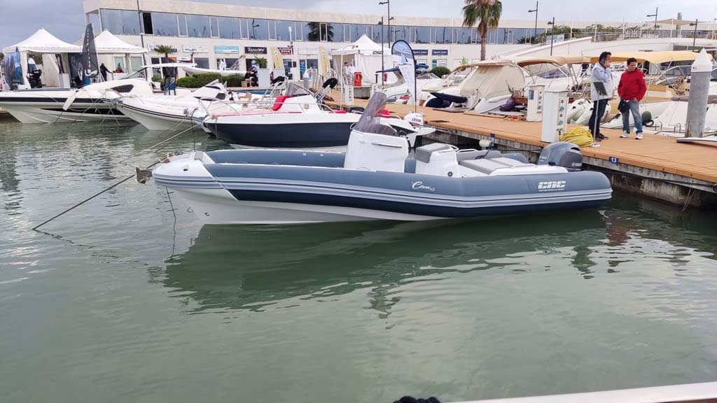 The design of thib RIB , as trademark, is focused on seaworthiness , but also having a design which is something else from common: wide spaces and comfort, clean deck, all that a RIB needs for comfortable cruisings and fishing. The high bow sheer makes the dry always safe and dry, while ensures a great sensation of protection; at the same time, allows large spaces at the bow. The layout is quite easy and functional: large stern platforms integrated in the deck surface; full beam stern seat, bolster driver’s seat which can contains a locker or a live bait tank, and center consolle with a small toilet which is a plus in a such small vessel. The bow layout provides a U seat which can be transformed to a full sundress area with a table – extension. The hull is deep, non stepped in order to improve trailerability, fast with small engines. This 6.8 RIB can be powered with a 115 hp and achieves nearly 40 knots with 130 hp.